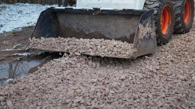 A small construction vehicle spreads crushed stones on a pathway in a snowy area, with a fenced section on the left and a wooden structure on the right. Pro Video
