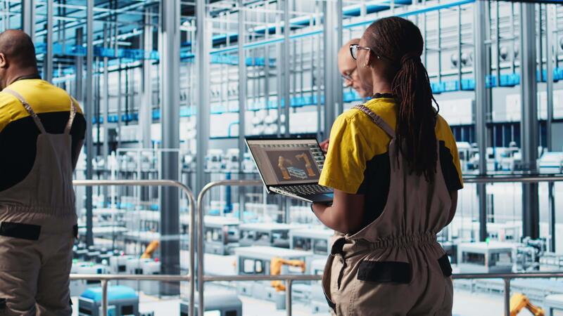 Engineers in industry 4.0 industrial plant controlling automated machinery, ensuring workflow continuity. Technicians in smart factory managing robotic arms and conveyor belts, camera A Pro Video
