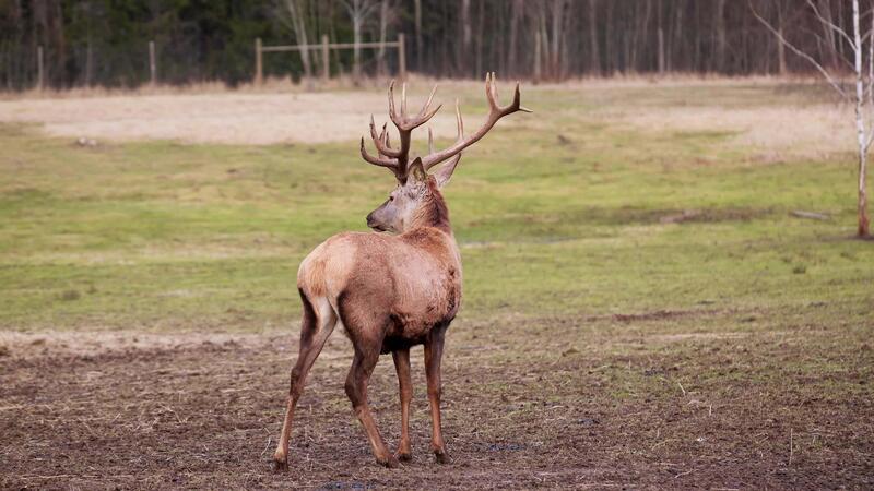 A deer with branching antlers stands on open ground, surrounded by grass and bare soil. Leafless trees and a faint wooden fence are visible in the background. Pro Video