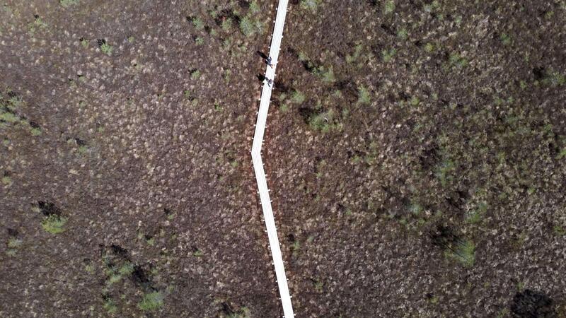 aerial view of zigzag wooden boardwalk crossing dry grassland with sparse vegetation, small trees, and visible shadows adding depth to the terrain. Pro Video
