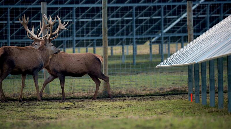 A large deer with prominent antlers stands by a wire fence in front of rows of solar panels, with grass and sparse trees visible in the background. Pro Video