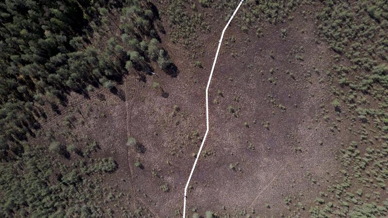 aerial view of a zigzag wooden boardwalk crossing dry grassland with sparse vegetation, small trees, and visible shadows adding depth to the terrain. Pro Video