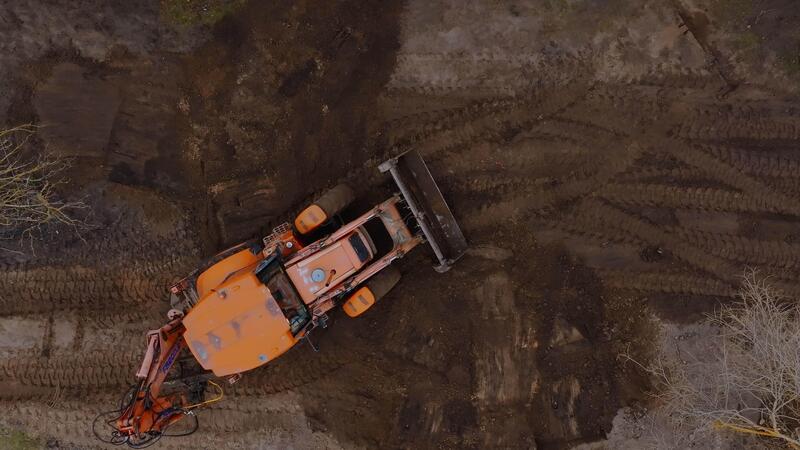 An aerial view shows an orange tractor on a dirt covered site with visible tire tracks, surrounded by sparse trees with bare branches in a natural setting. Pro Video
