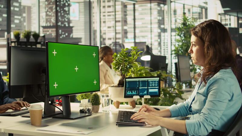 Employee at work having trouble with broken keyboard while using isolated screen PC. Office clerk in workplace unable to continue work on mockup PC because of defective computer peripherals, camera B Pro Video