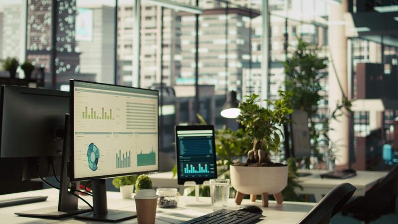 Modern workspace with analytical data dashboards displayed on devices in bright office environment. PC screen on desk with financial statistics graphs next to potted plants, zoom in shot Pro Video