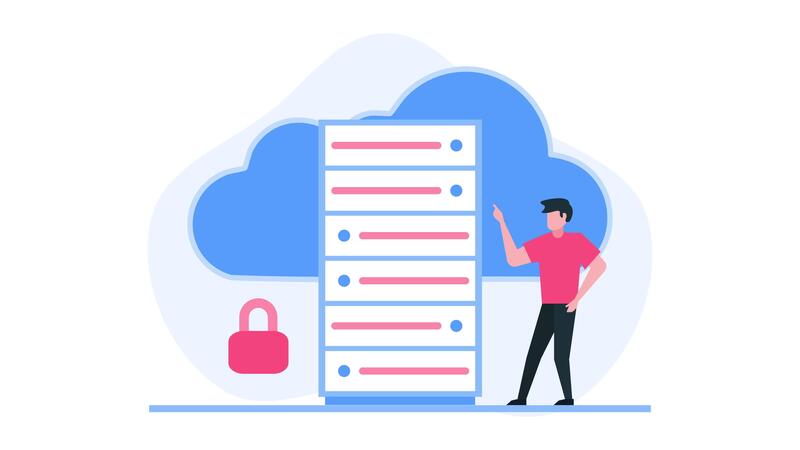 Server rack securely stored in a cloud, guarded by a man with a padlock. Ideal for depicting data security concepts. Pro Video