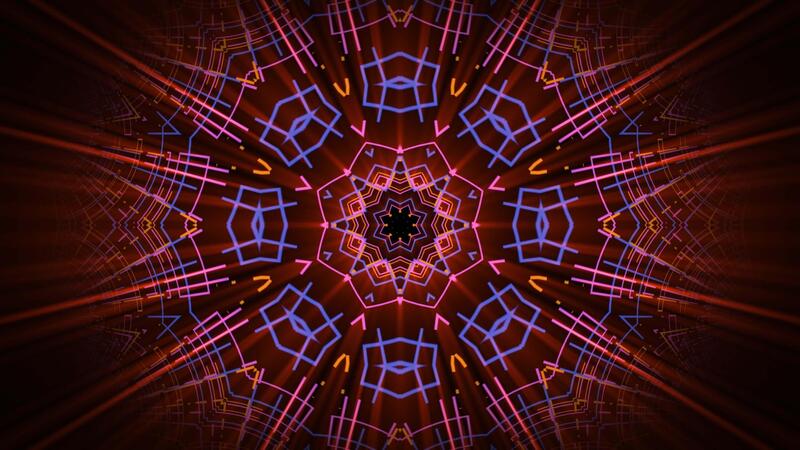 Hypnotic mandala animation with intricate kaleidoscope patterns and bright orange light rays. Seamless loop screensaver with psychedelic shapes morphing on a dark background. Motion graphics, 4K 30fps Pro Video
