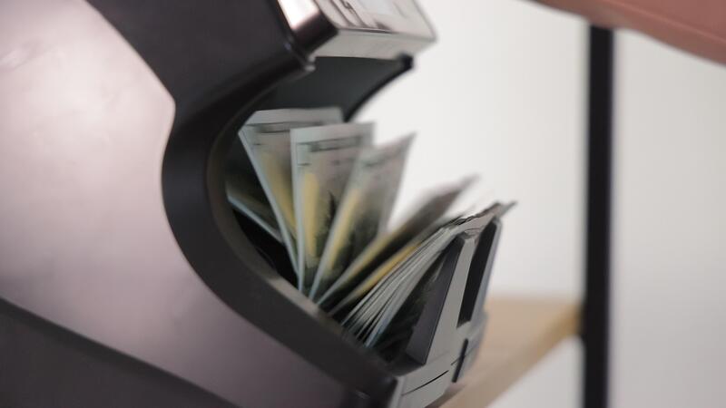 Close-up of US hundred dollar bills stacked in counting machine, emphasizing currency verification, financial accuracy, and banking transaction process Pro Video