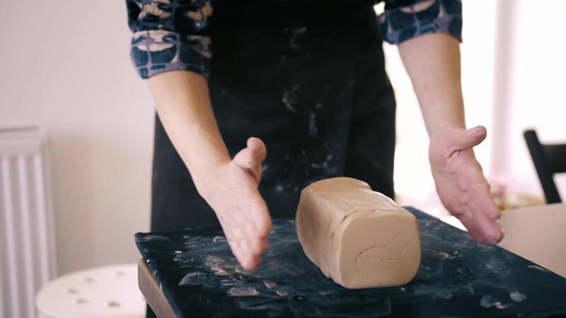 Female hands crumple and roll out piece of clay on table, front view. Potter prepares clay for processing on table. Pro Video