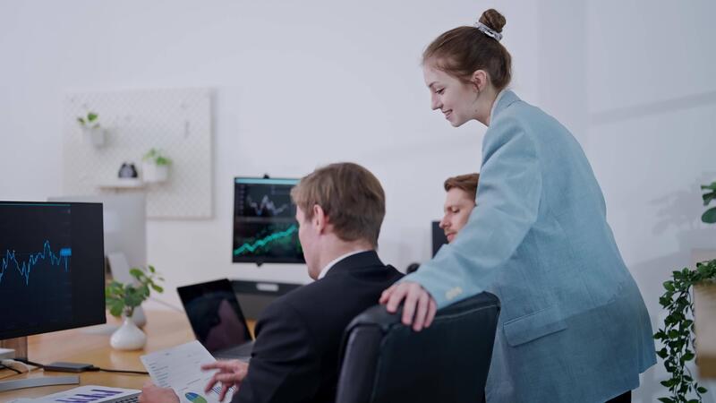 Team collaborating on financial analysis in modern office environment with multiple screens displaying data Pro Video