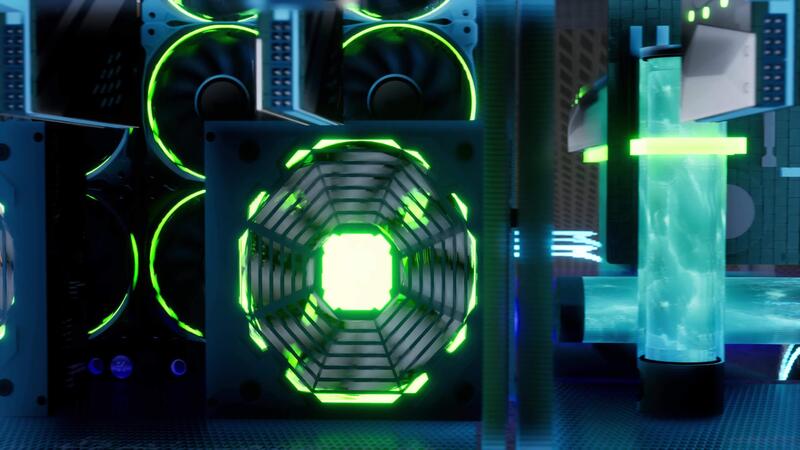 3D animation of mining equipment on stand racks mine cryptocurrency in steel container. Blockchain technology application specific integrated circuit datacenter. Server room lights. 12 Pro Video