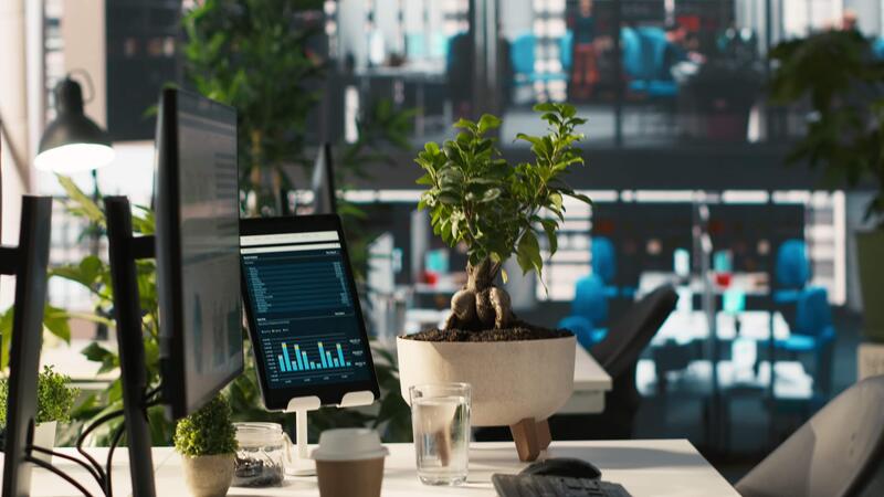 Computer screen on office desk displaying financial charts of company profits performance metrics. Data analytics on PC display showing corporate business earnings KPIs, panning shot Pro Video