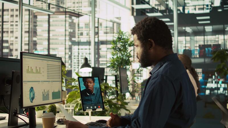Manager chatting with worker in videoconference, setting goals for performance and company growth. Manager in teleconference business meeting with employee using tablet, camera B Pro Video