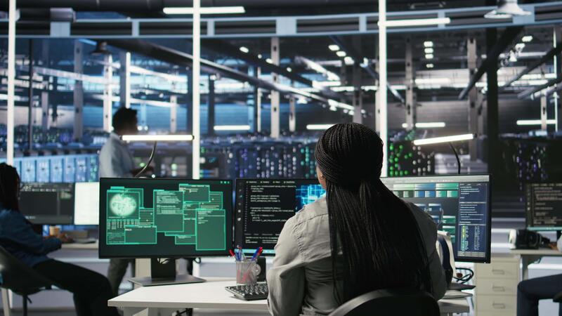 Server farm IT expert responds to security breach alert displayed on computer monitor, working to secure hardware. Data center employee attempts to protect equipment during cyberattack, camera A Pro Video