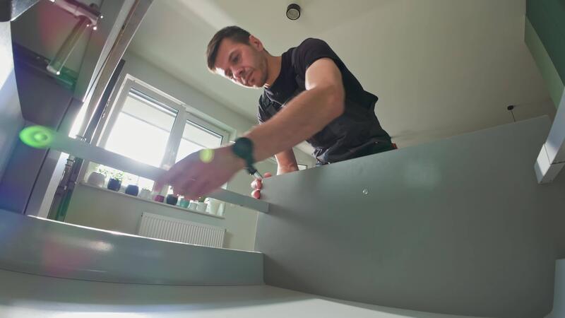 Man assembling kitchen drawer in modern cabinet using screwdriver. Handyman installing and adjusting drawer slide mechanism in kitchen. Furniture installation Pro Video