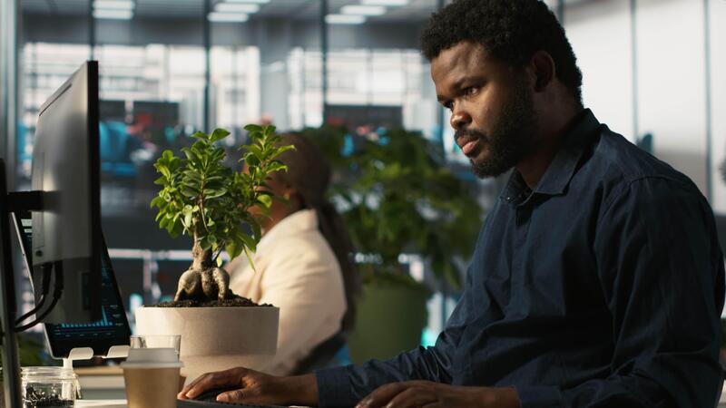 Employee in office leaving desk to present revenue figures on tablet. Accountant finishing project task of comparing company statistical numbers on device, going to present data, camera A Pro Video