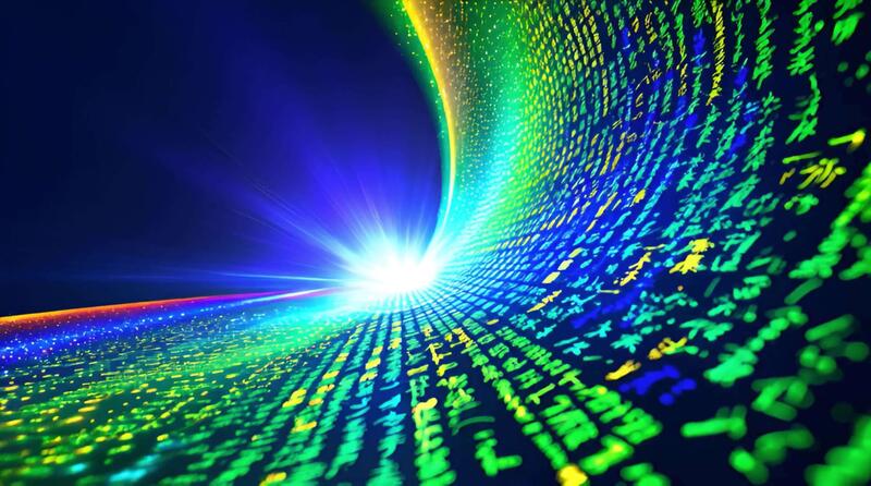 Digital tunnel illuminated with vibrant light streaming through matrix-style code, representing technological innovation and data communication flow Free Video
