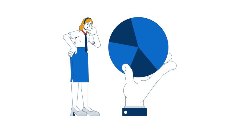 Taking closer look at data 2D animation. Professional analyzing piechart. Female analyst pie chart interpretation animated character cartoon flat concept metaphor 4K isolated on white Pro Video
