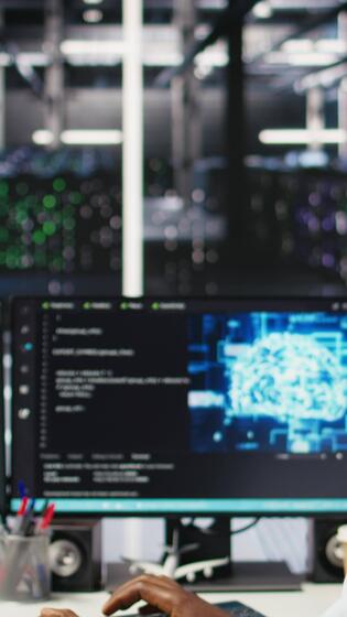 Data center employee talking in headset mic, coordinating technicians setting up hardware for artificial intelligence deployment. Server room worker engages in remote call with engineers, camera A Pro Video