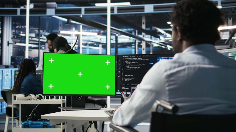 Data center engineer with paraplegia using AI deep learning algorithms on green screen PC to analyze datasets. Server room worker in wheelchair at chroma key PC using AI neural networks, camera A Pro Video