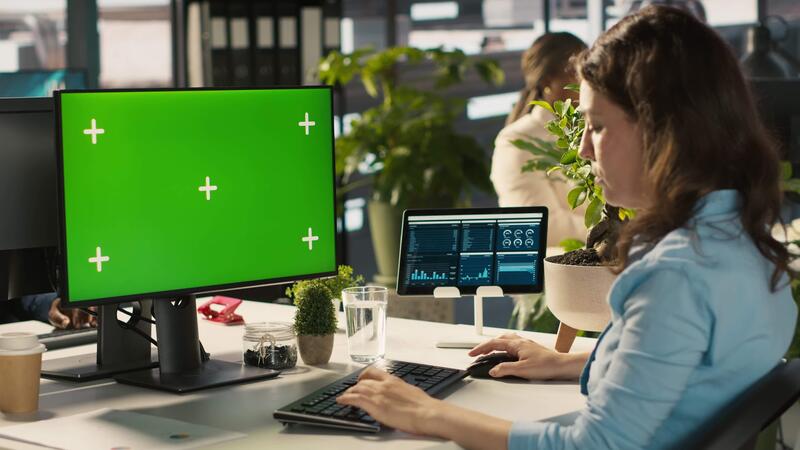 Green screen PC in office used by employee working on company administrative tasks. Mockup computer display on desk used by worker reviewing business data metrics, camera A Pro Video