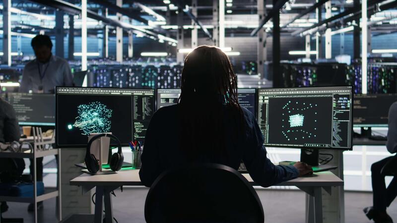 Data center engineer implements AI virtualization frameworks to optimize server clusters. Server hub IT professional doing artificial intelligence predictive analysis, camera A Pro Video