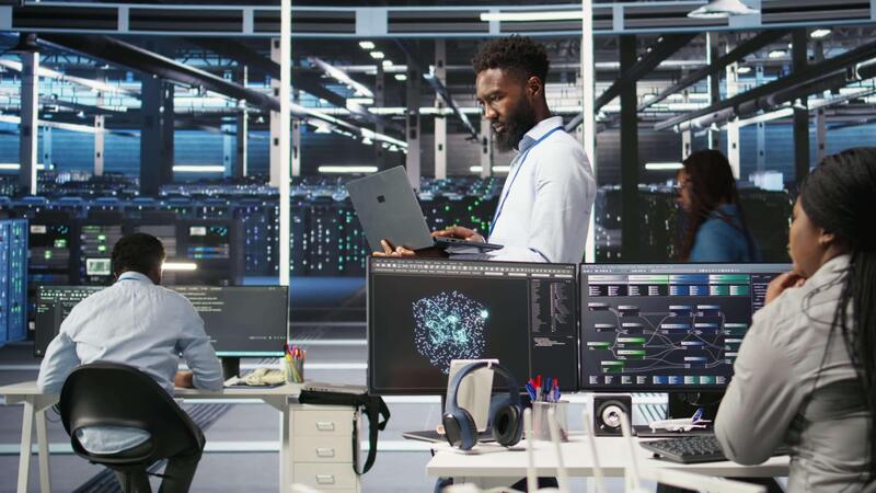 Data center programmer uses node tree software to identify equipment performance issues. African american server farm worker reviews data analysis graph to minimize hardware failures, camera A Pro Video