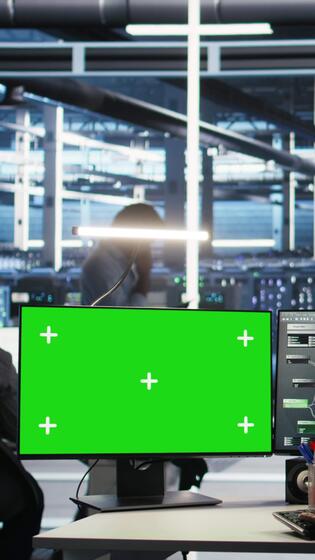 Vertical Server farm engineer using node tree systems on green screen PC to categorize unstructured data. Data center IT expert uses visual programming software on mockup chroma key computer, camera A Pro Video