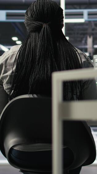 Vertical Server farm IT specialist using PC to apply artificial intelligence technology minimizing system downtime. Engineer using computer to develop and deploy AI solutions optimizing equipment, camera A Pro Video