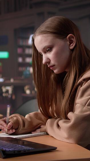 Vertical University student does research on foreign affairs via primary source materials and academic resources to create an assignment. Girl working hard for a scholarship and diploma. Camera B. Pro Video