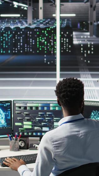 Data center admin using artificial intelligence neural network models to configure hardware. Man works on AI programming language in server room, optimizing system functionality, camera A Pro Video