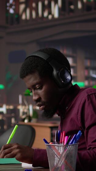 Vertical Black guy using study music to help with deep focus for academic success, consulting the campus university database to find reliable sources. Male college student fights for diploma. Camera B. Pro Video
