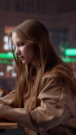 Vertical College student captivated by literature assignment at the academic library on campus, working on bachelor degree paperwork. Uses primary source materials from the database. Camera A. Pro Video