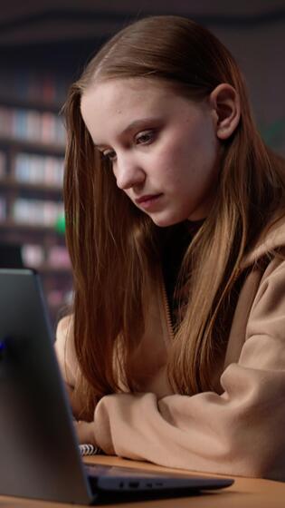 Vertical University student does research on foreign affairs via primary source materials and academic resources to create an assignment. Girl working hard for a scholarship and diploma. Camera A. Pro Video