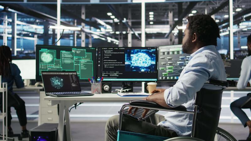 Data center engineer in wheelchair using AI requesting help from coworkers during security breach. Server farm worker with disability aided by colleagues to fight hacker attack stealing data, camera A Pro Video