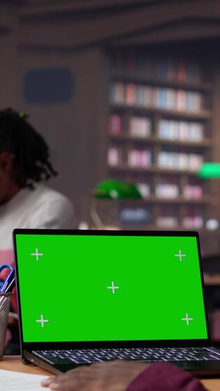 Vertical College student looks at a copy space on laptop while collecting notes from reliable academic sources, consulting the campus library books collection for an assignment. Student life. Camera A. Pro Video