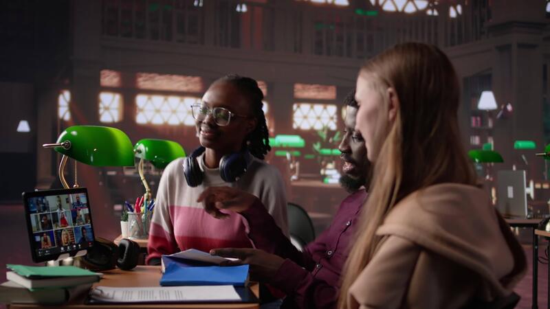 Group of diverse pupils engaging in online course via call, participating at the remote class seminar from the campus library. Young people takes notes from academic tutor. Camera B. Pro Video