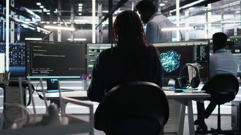 Vertical Data center programmer seeing critical error message while using node tree software to analyze datasets. Server room worker receiving glitch popup warning while using visual programming tool, camera A Pro Video