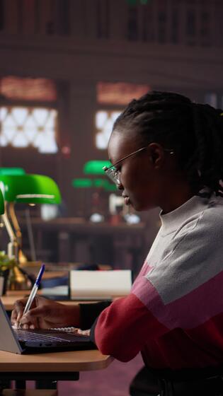 Vertical Young scholar focuses on exam preparations in the campus library with colleague, takes notes on laptop from reference books in a peaceful study setting. Girl uses the database materials. Camera A. Pro Video