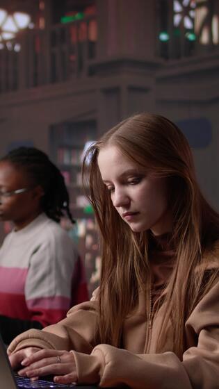 Vertical College student captivated by literature assignment at the academic library on campus, working on bachelor degree paperwork. Uses primary source materials from the database. Camera B. Pro Video