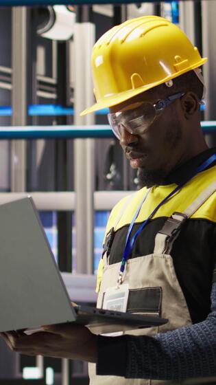 Vertical Professional working in smart factory, testing automated systems to ensure reliability. African american man in industry 4.0 plant using notebook to identify bottlenecks and optimize, camera A Pro Video