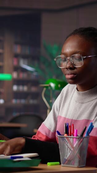 Vertical University student engrossed in texting with classmates at the library, chatting with friends instead of studying. Girl discussing with colleagues about an assignment. Camera A. Pro Video