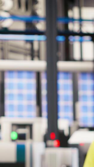 Vertical Technician in industrial plant using tablet app to diagnose equipment errors. Manufacturing factory specialist using digital device to coordinate repair tasks on assembly lines, camera B Pro Video