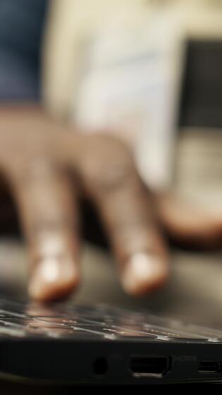 Vertical Close up of smart factory worker using laptop to test automated systems, monitoring production metrics. Industry 4.0 plant expert inspecting machinery to identify and fix malfunctions, camera B Pro Video