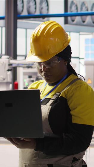 Vertical Portrait of smiling solar panels factory engineer analyzing data on laptop to predict gear failures. Happy photovoltaics plant employee using notebook, following maintenance procedures, camera A Pro Video