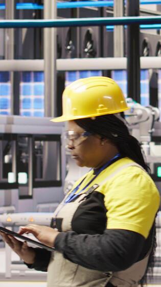 Vertical Smart factory engineer using laptop to implement automated workflows and control systems, computerizing operations. Technician integrates sensors into production using notebook, camera A Pro Video