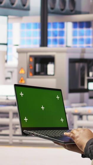 Vertical Technician in industrial plant using green screen laptop to diagnose equipment errors. Factory specialist using chroma key mockup notebook to coordinate repair tasks on assembly lines, camera A Pro Video
