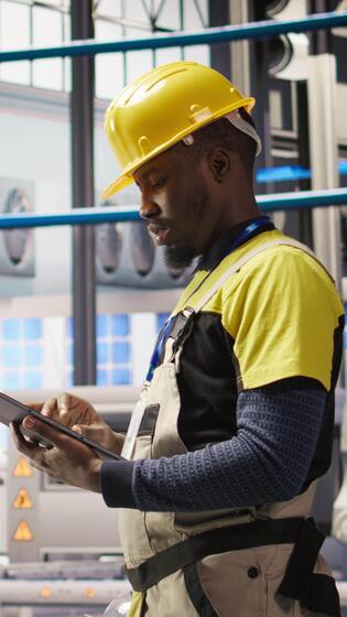 Vertical Smart factory expert uses tablet to implement automated workflows and control systems, computerizing operations. Industry 4.0 plant technician integrates sensors into production using device, camera A Pro Video