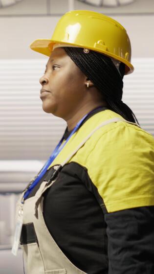 Vertical Technician walking in industrial plant, using toolbox to diagnose and fix equipment errors. African american woman in manufacturing factory coordinates repair tasks on assembly lines, camera B Pro Video