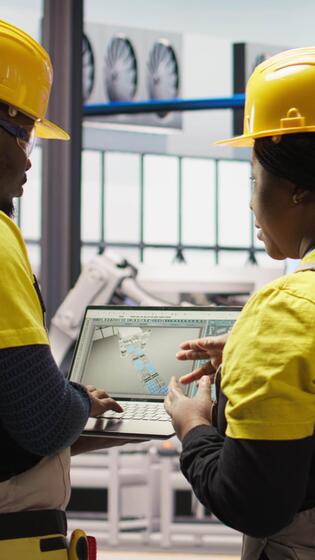Vertical Smart solar panels factory engineering team using laptop to oversee production lines. Teamworking industry 4.0 plant coworkers ensure machinery operates at optimal efficiency using notebook, camera A Pro Video
